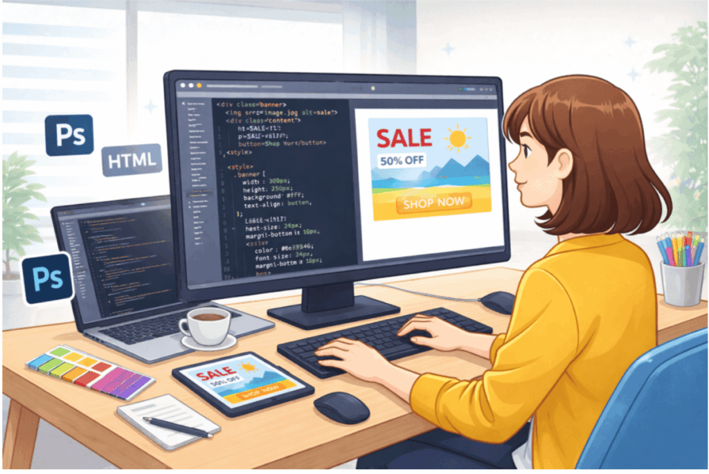 代表的なのが、Photoshopを使った静止画制作と、HTML形式のバナー制作です。それぞれの特徴を理解し、目的に応じて使い分けることが重要です。