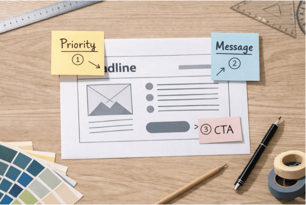 レイアウトは、センスだけに頼って決めるものではありません。成果を出すバナーには、共通した設計手順があります。順番に考えることで、誰でも論理的にレイアウトを組み立てられます。ここでは、実務で使える具体的な流れを解説します。