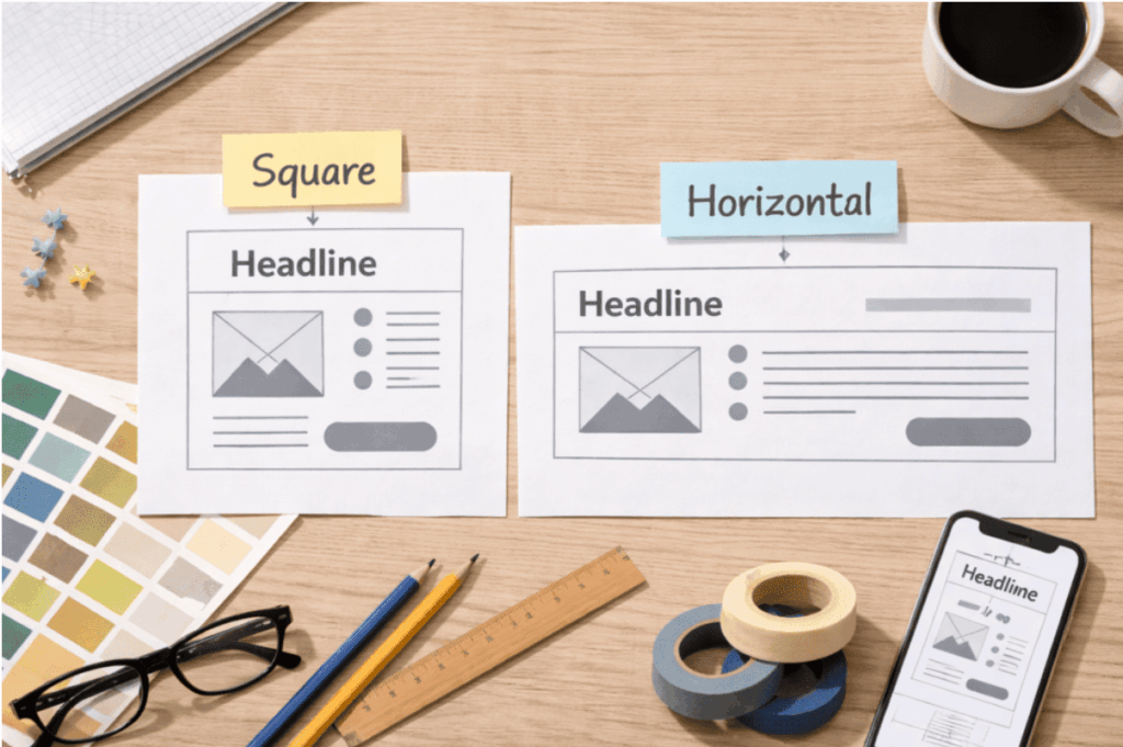正方形はSNS広告に向いており、中央に視線が集まりやすい特徴があります。横長はWebサイト上部などで使われることが多く、左から右への流れを意識した設計が有効です。