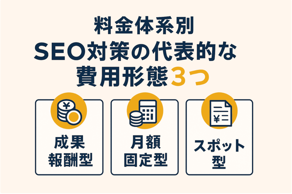 同じ「SEO対策」でも、依頼方法によって費用や支払いのタイミング、リスクの大きさが異なります。ここでは、現在主流となっている代表的な3つの料金体系をわかりやすく解説します。
